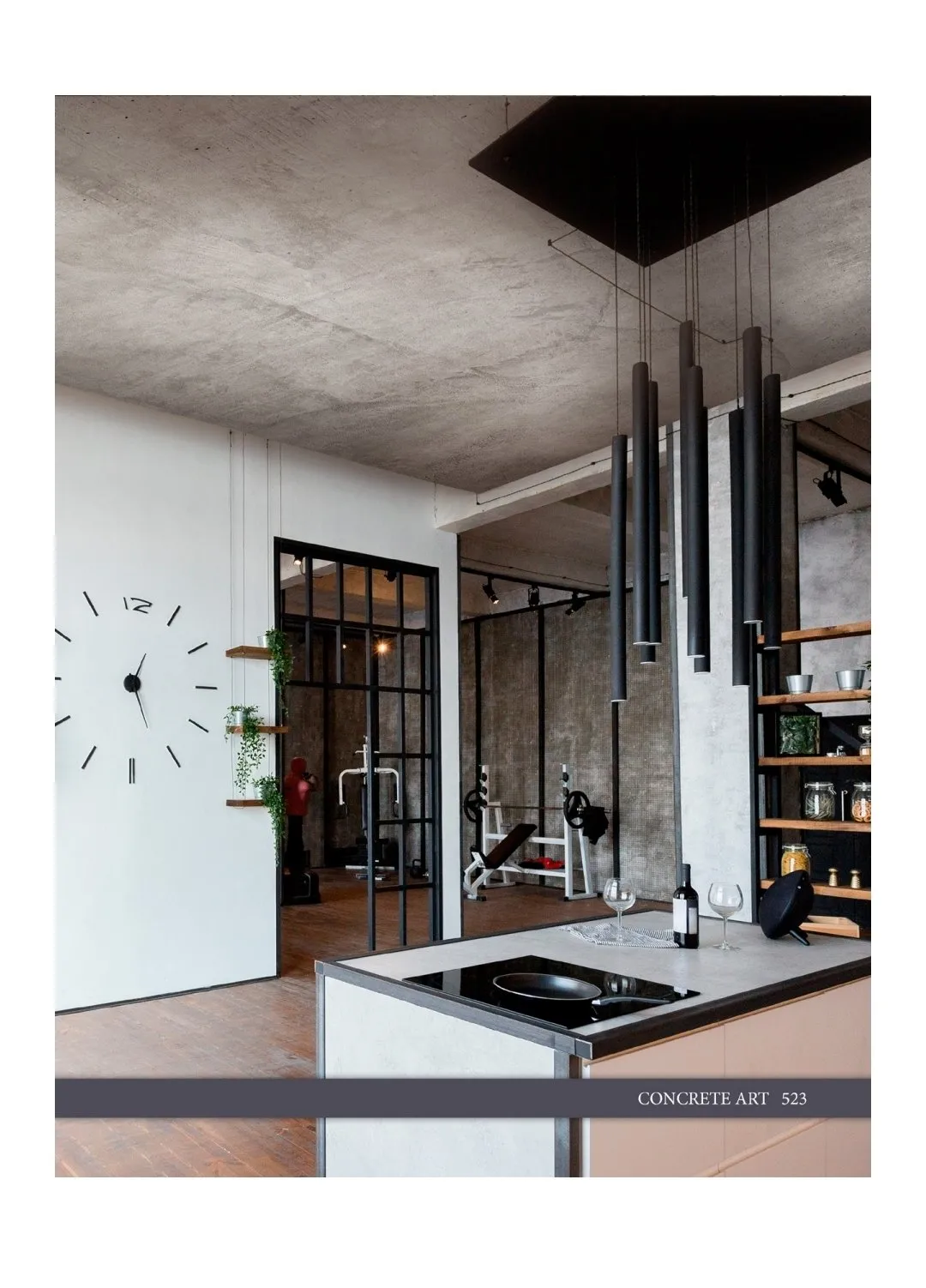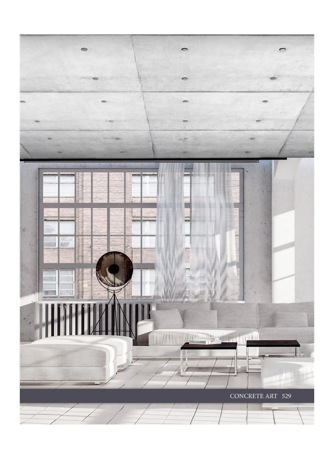 • Современная эстетика — реалистичная имитация бетона от светло-серого до насыщенного антрацита гармонично сочетается с кирпичом, деревом, стеклом и другими материалами. Это удачный пример оформления потолков в интерьерах в стиле лофт, индустриальный, минимализм.